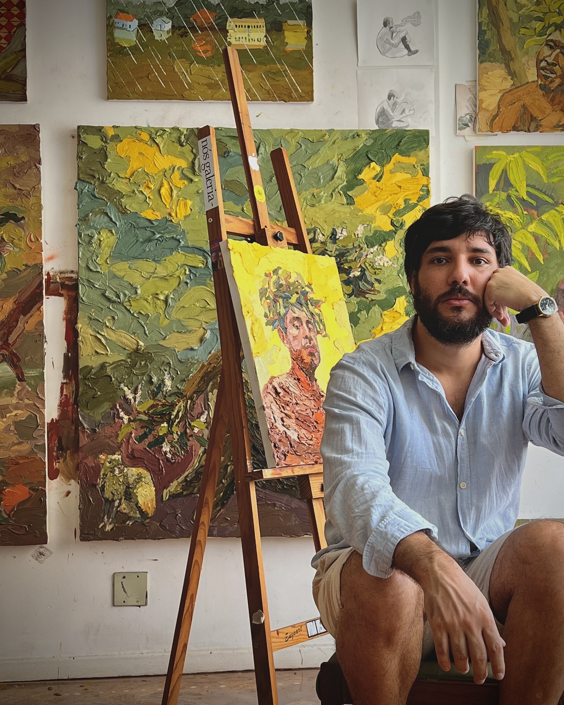 Rafael Prado, natural de Porto Velho, Rondônia, reside atualmente no Rio de Janeiro e aciona uma memória afetiva com a natureza para criar sua nova exposição. O título da mostra individual que chega em Belo Horizonte é “Lembro das árvores de quando eu ainda nem era nascido”. Ele trabalha com pintura e temas de cunho social e revela: “O título vem de uma memória de infância que eu tenho. Lá em Porto Velho tem uma capela, quase que da fundação da cidade e eu lembro que minha mãe um dia me levou para um passeio histórico nessa capela e eu senti que já conhecia aquele lugar. Só que na lembrança que me ocorreu, a capela era de outra cor e tinham muitas árvores grandes em volta. E quando visitei quando criança, já não era assim. É inspirado em uma memória anterior a mim. É uma memória ancestral”.